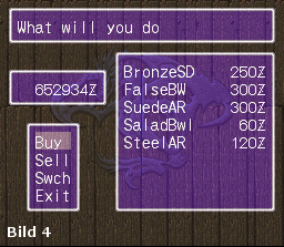 Menge Geld, die Du hast und vier Befehle aus denen Du wählen kannst (siehe Bild 4): Buy), Sell, Swch und Exit (Buy, Sell und Exit sind oben schon beschrieben).